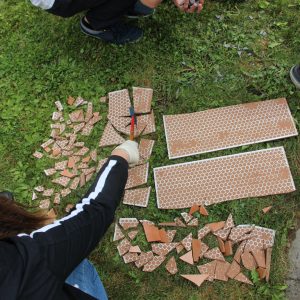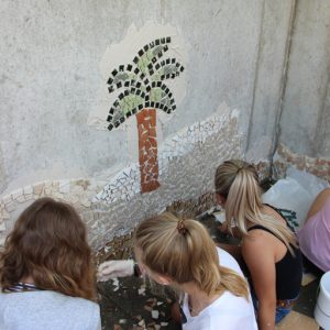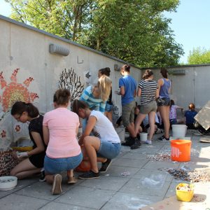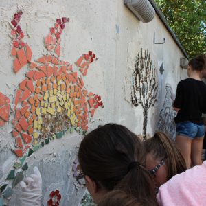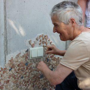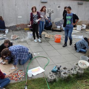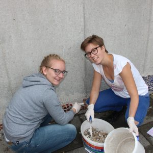 Auf Einladung des Wohnhauses des Diakoniewerks Bad Leonfelden, konnten die Schülerinnen und Schüler der 5A gemeinsam mit einigen Bewohnern und Bewohnerinnen eine Betonwand gestalten. Da wir in der 6.Klasse nach Barcelona reisen und diese Stadt voll von Mosaik-Kunstwerken von Antoni Gaudi ist, hatten wir die Idee, ein Mosaik zu entwerfen, um diesen Bereich attraktiver zu formen.